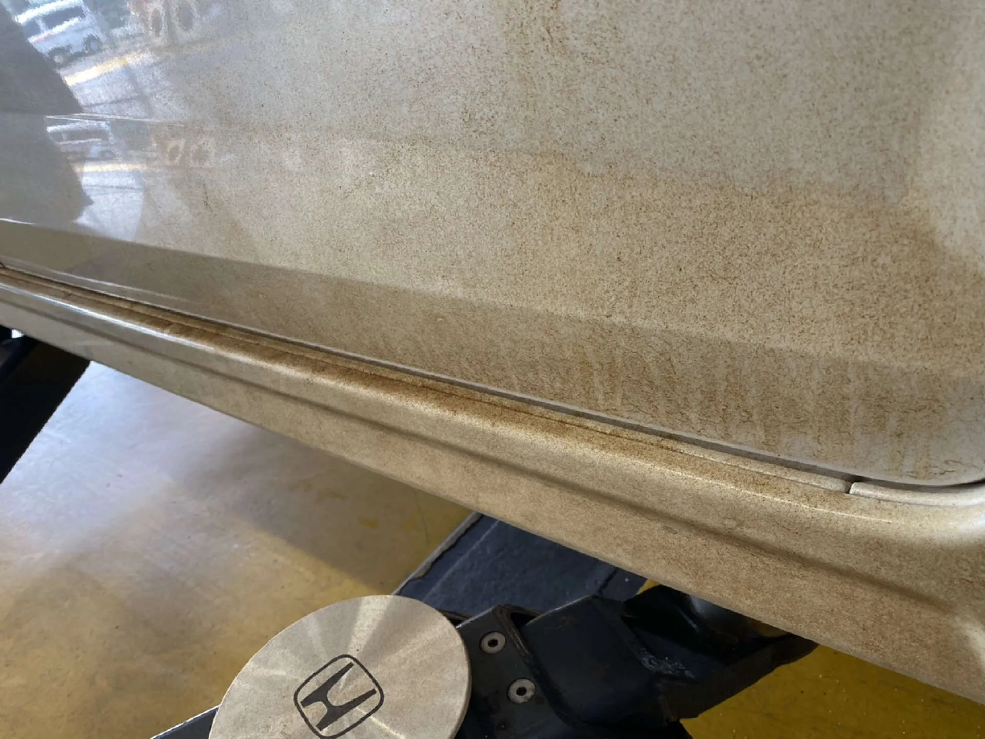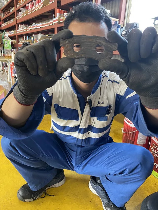 ここまでくると、ブレーキのピストンが飛び出し、ブレーキオイルが漏れて、ブレーキが効かなくなり非常に危険です。今回は車両の右側が危険な状態でした。