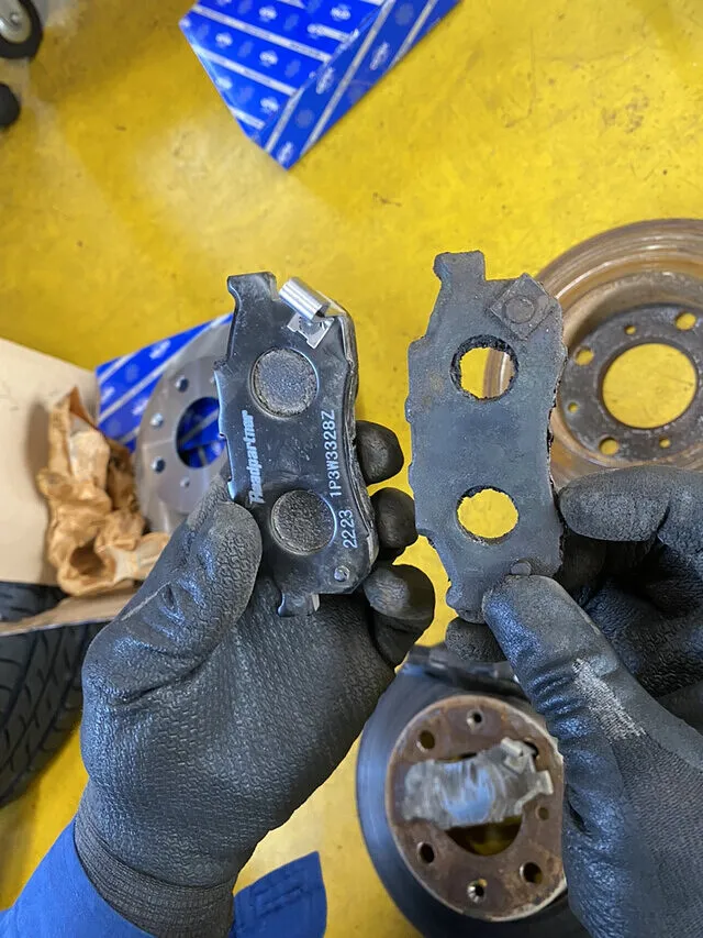 新品パットと車両右側パットの比較画像です。床が透けて見えます。