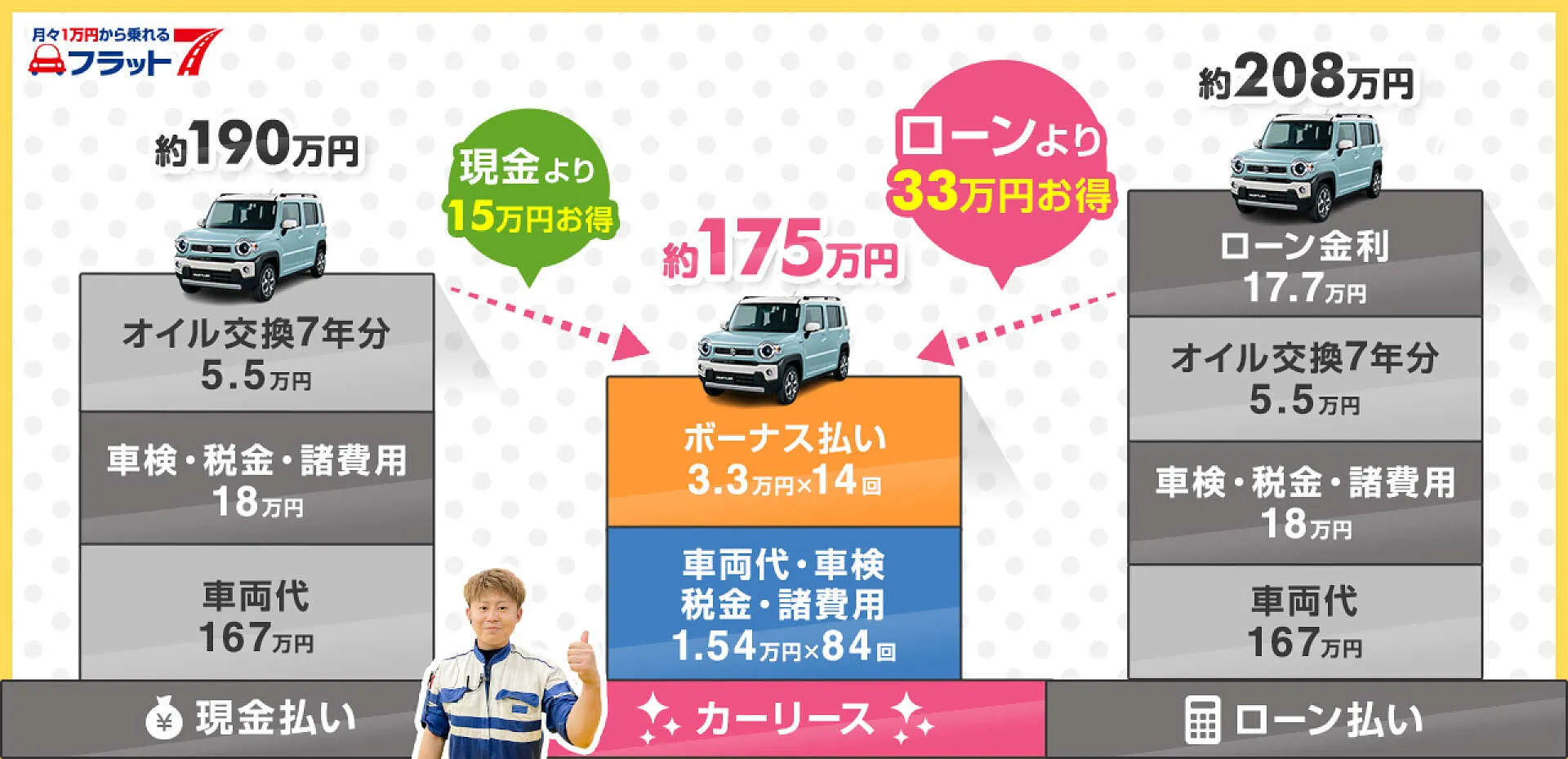 車両代、車検費用、自動車税、自賠責保険料、オイル交換など、7年間の車の維持費も全て月額費用にコミコミ。